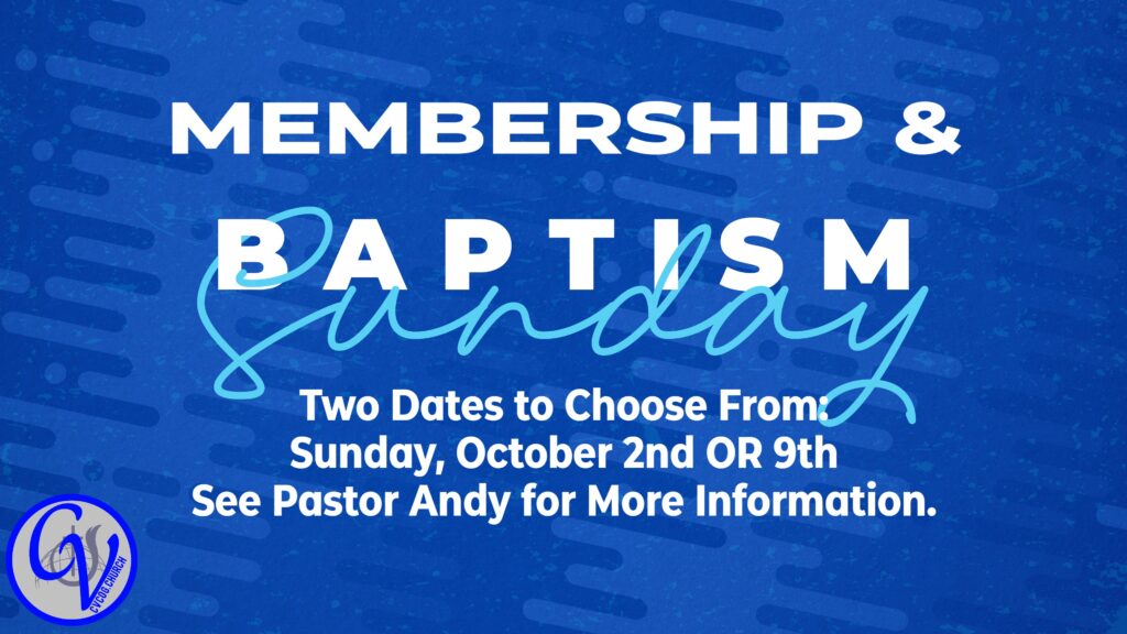 MEMBERSHIP & BAPTISM SUNDAY ~ We have TWO dates you can choose from: this Sunday, October 2nd OR next Sunday, October 9th. Please see Pastor Andy for more information and to sign up!!! Let's join together as a church family and support those that are being baptized and joining the church membership.